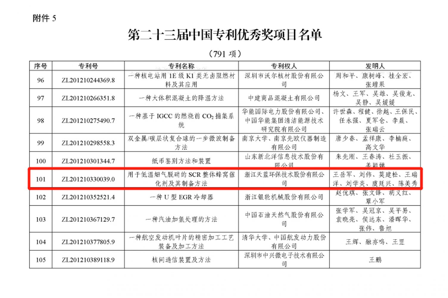 在剛剛揭曉的第二十三屆中國(guó)專(zhuān)利獎(jiǎng)中,我司發(fā)明專(zhuān)利“用于低溫?zé)煔饷撓醯腟CR整體蜂窩催化劑及其制備方法”榮獲中國(guó)專(zhuān)利獎(jiǎng)優(yōu)秀獎(jiǎng)。